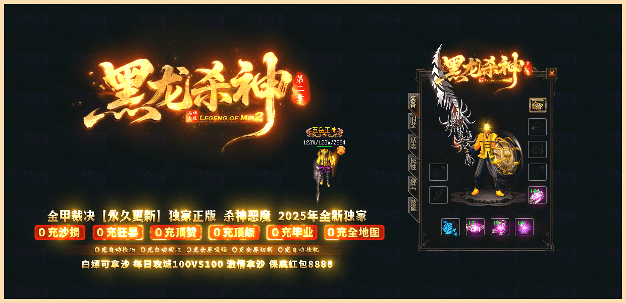 ★黑龙杀神★:已经稳定开放半年,10倍充值,百倍爆率,千倍激情,万人拿沙,所有装备靠打,白嫖永远不死!